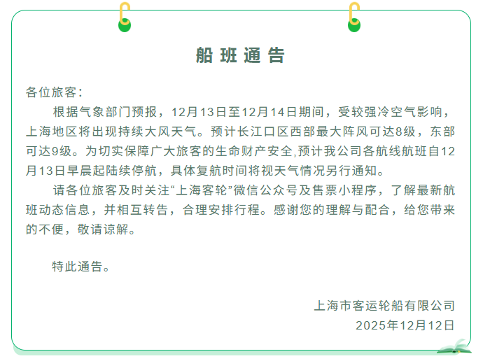 根据气象部门预报,12月13日至12月14日期间,受较强冷空气影响,上海地区将出现持续大风天气。预计长江口区西部最大阵风可达8级,东部可达9级。为切实保障广大旅客的生命财产安全,预计市客运轮船有限公司崇明三岛航线航班自12月13日早晨起陆续停航,具体复航时间将视天气情况另行通知。